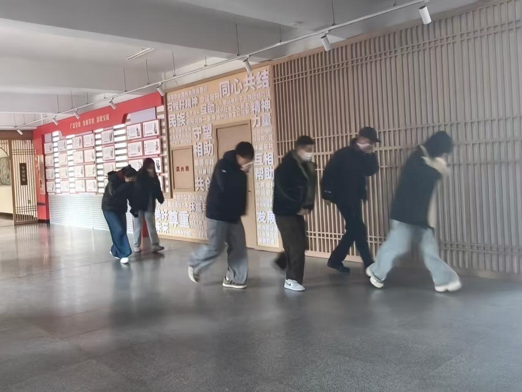 演练伊始,楼内全体师生迅速启动应急响应:各班级按既定疏散路线,俯身低姿、捂好口鼻,快速且有序地从教室撤离至室外安全集结点,全程紧张高效、秩序井然。